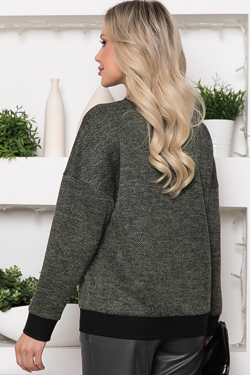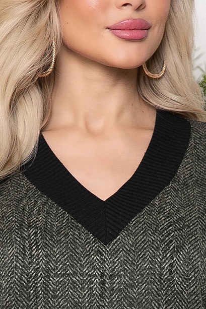 Джемпер из трикотажного полотна в елочку свободного силуэта. V-горловина,манжеты рукавов и притачной пояс из вискозной трикотажной рибаны.