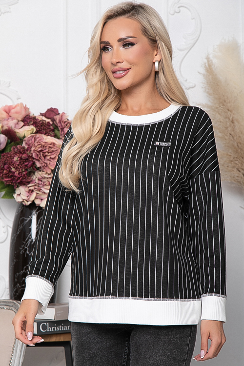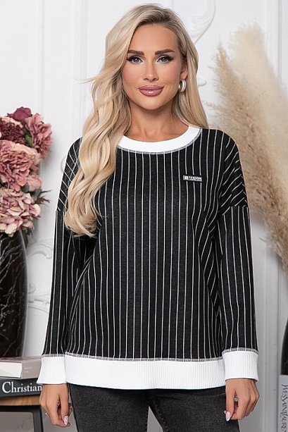 Джемпер из жаккардового трикотажного полотна в полоску свободного силуэта, дополнен отделкой вискозной,трикотажной белой рибаной.