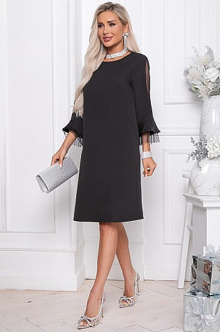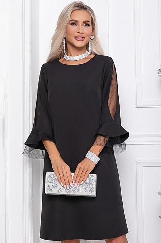 - Платье А-образного силуэта из костюмной ткани. Рукав 3/4 с оригинальной вставкой из сетки и двойным воланом, верхний из основной ткани, нижний из сетки.
