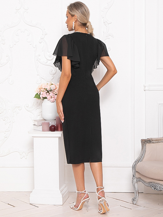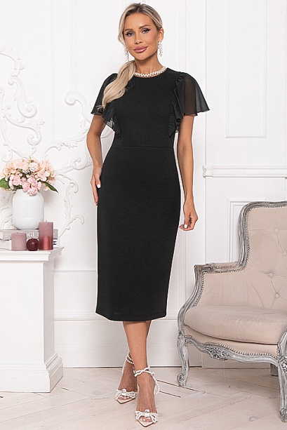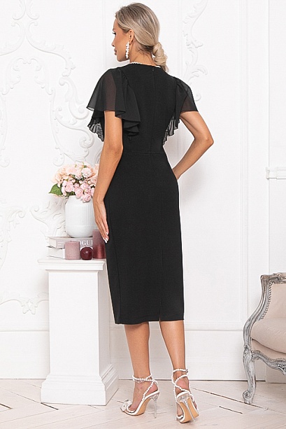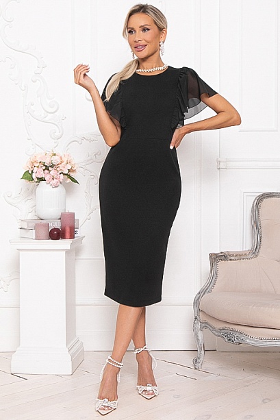 - Платье полуприлегающего силуэта из трикотажного полотна.В среднем шве спинки застежка молния и шлица.Изюминка платья рукава-воланы из шифона.