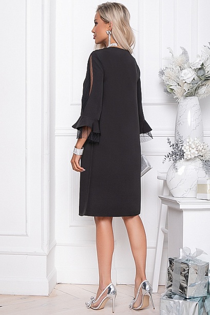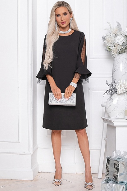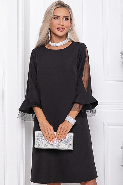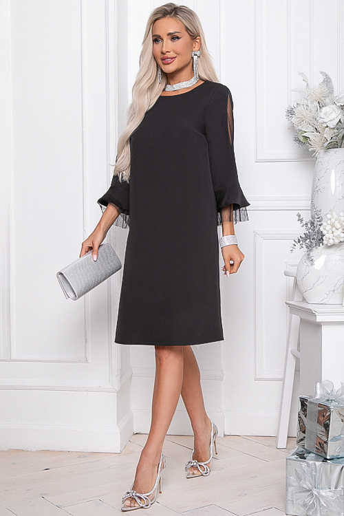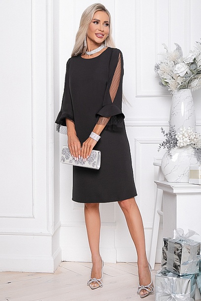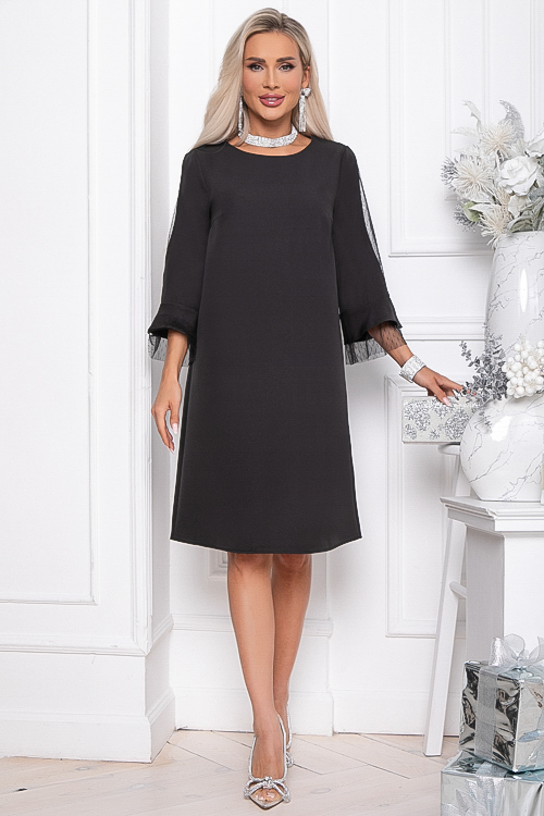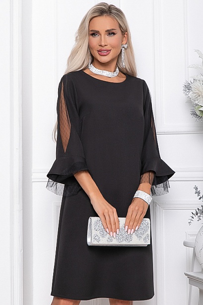 - Платье А-образного силуэта из костюмной ткани. Рукав 3/4 с оригинальной вставкой из сетки и двойным воланом, верхний из основной ткани, нижний из сетки.