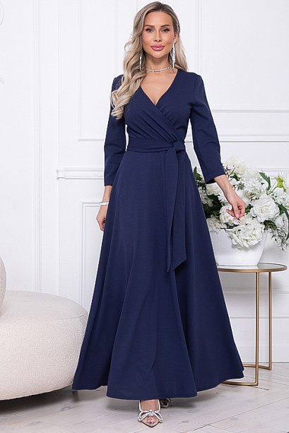 - Нарядное элегантное платье из трикотажного полотна,отрезное по лини талии с расклешенной юбкой.Лиф платья с полным запахом,задрапированным по линии талии.Пояс из основной ткани в комплекте.
