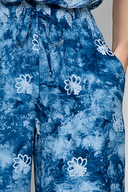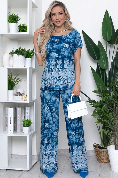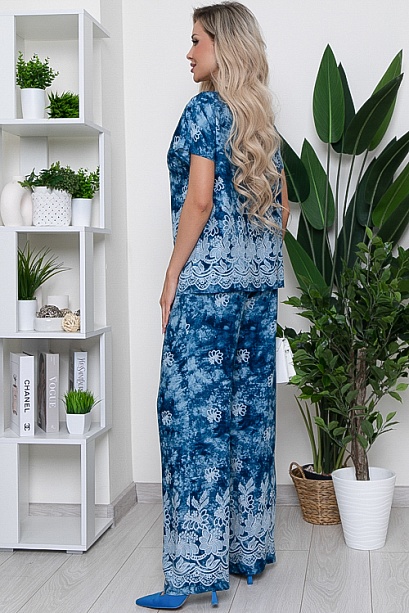 Брючный комплект из комфортного,вискозного текстильного полотна.Блузка свободного силуэта.Брюки свободного силуэта с посадкой по талии присборенные на эластичную резину и дополненные регулируемой кулиской.