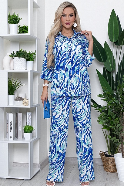 Комплект из комфортного вискозного текстильного полотна,состоит из рубашки и брюк.Рубашка свободного силуэта с центральной застежкой на пуговицы.Воротник отложной на стойке.