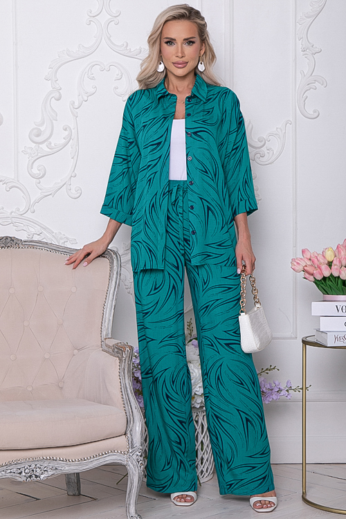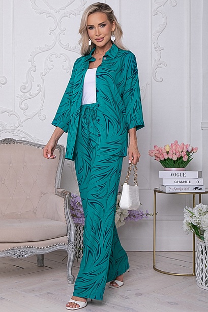 Комплект из комфортного вискозного текстильного полотна,состоит из рубашки и брюк.Рубашка свободного силуэта с центральной застежкой на пуговицы.Воротник отложной на стойке.