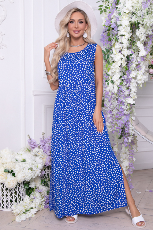 Платье из комфортного вискозного текстильного полотна свободного силуэта длиной миди с разрезами по бокам.