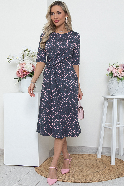 Платье из трикотажного полотна А-образного силуэта.Перед платья с эффектной драпировкой в области талии с одной стороны.