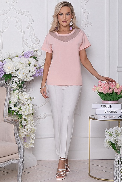 Блузка из текстильного полотна с цельнокроеными рукавами.По горловине украшена мягкой сеткой с легким люрексом.