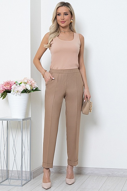 Брюки из вискозной костюмной ткани со средней посадкой зауженные к низу,с заутюженными стрелками.Без застежки,с имитацией гульфика,пояс на эластичной резине.По бокам функциональные карманы.