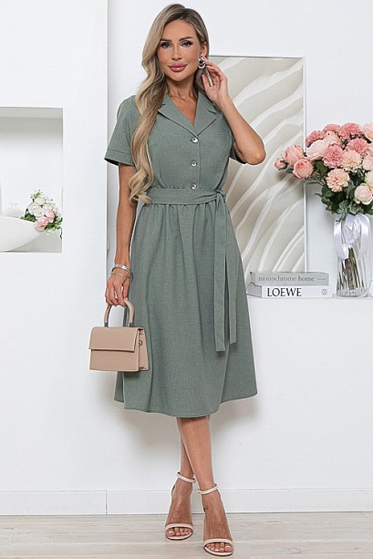 Платье из комфортной костюмной ткани ,отрезное по линии талии, присборено на резину с расклешенной юбкой.Лиф изделия с центральной застежкой и отложным воротником с лацканами.Пояс из основной ткани в комплекте.