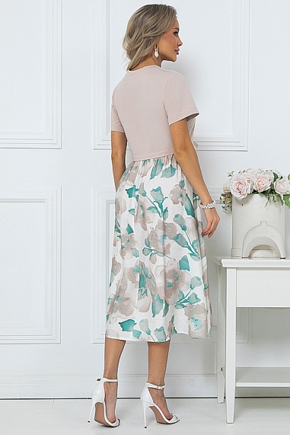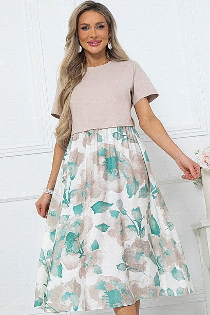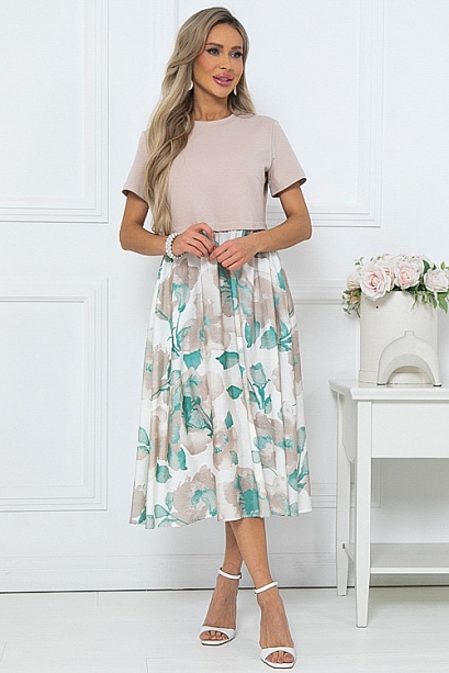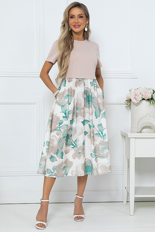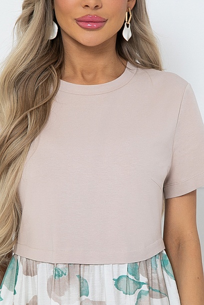 Комбинированное платье из двух видов ткани свободного силуэта с расклешенной юбкой и функциональными карманами по бокам.Верх из хлопкового трикотажа кулирка.Юбка из легкого вискозного текстильного полотна.