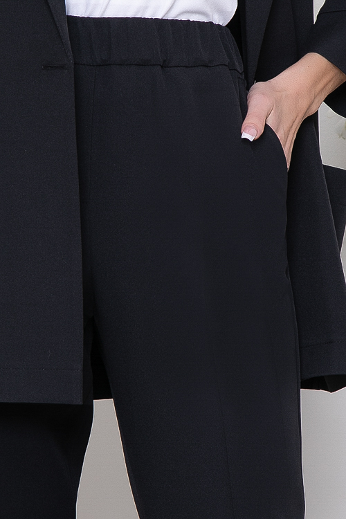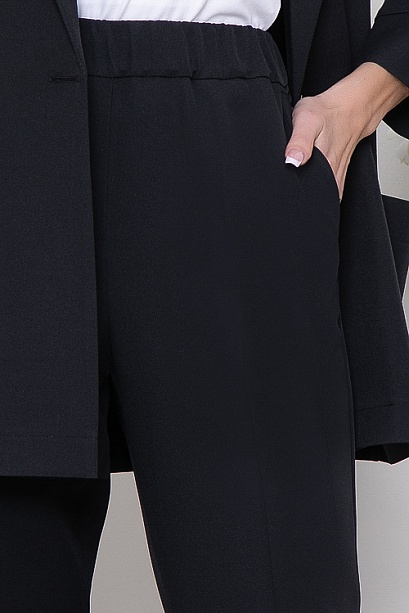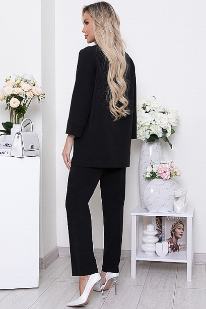 Брючный комплект из костюмной ткани.Жакет свободного силуэта с застежкой на одну пуговицу.Воротник отложной с лацканами.По переду жакета накладные удобные карманы.
