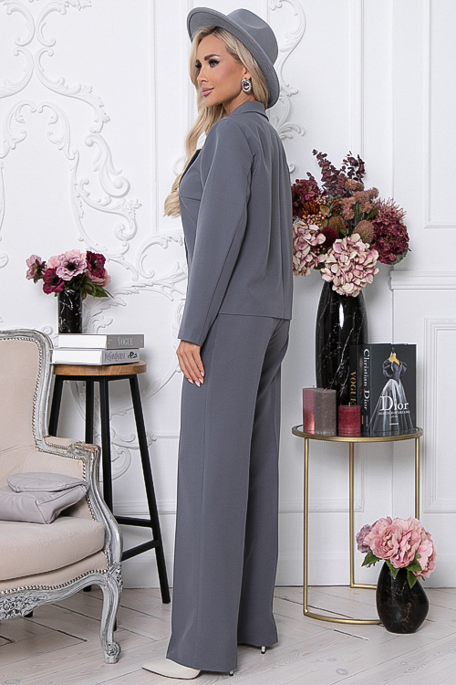 Комплект брючный из костюмной ткани.Жакет прямого силуэта с отложным воротником с лацканами.Рукав втачной длинный.Застежка на две пуговицы.Брюки прямые,свободные с заутюженными стрелками,по бокам функциональные карманы.Пояс притачной с эластичной резиной по спинке.В среднем шве переда имитация гульфика.