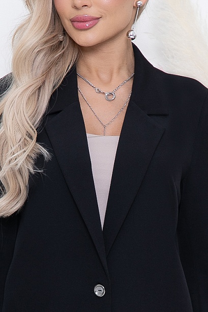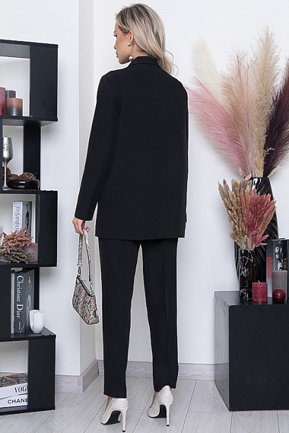 Брючный комплект из костюмной ткани.Жакет свободного силуэта с застежкой на две пуговицы.Воротник отложной с лацканами.По переду жакета накладные удобные карманы.Рукав втачной длинный.Брюки с высокой посадкой, зауженные к низу, по поясу эластичная резина .В среднем шве переда имитация гульфика.По бокам функциональные карманы.Заутюженные стрелки придают стройность фигуре.