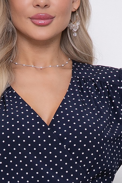 Платье из текстильного полотна в горох,отрезное по линии талии.Перед с полным функциональным запахом,затягивающимися поясками по фигуре.По лифу переда выполнена сборка от кокетки.Рукав длинный,собранный по низу на широкую резину.