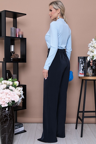 • Брюки-палаццо  из комфортной костюмной ткани,с высокой посадкой по талии,застегивающиеся на молнию в гульфике.По переду от пояса застрочены  мягкие складки.В боковых швах функциональные карманы.Пояс притачной,застегивающийся на одну пуговицу,посаженный по спинке на резину.