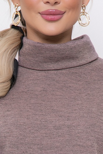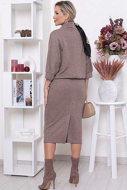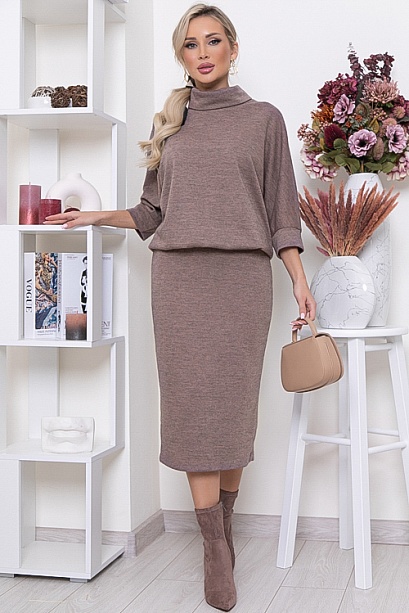 • Платье из мягкого эластичного трикотажного полотна.Лиф платья свободного силуэта,с цельнокроеными рукавами на манжете и воротником "хомут".Юбка прямая,слегка зауженная к низу,по спинке со шлицей.По талии платье зафиксировано на резину.Из верхней части платья формируется глубокий свободный напуск.