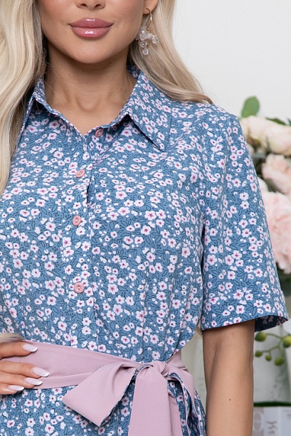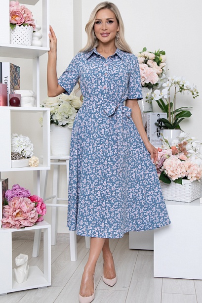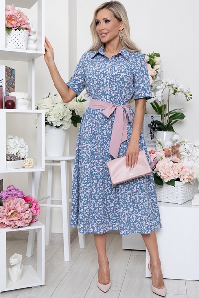- Платье из текстильного полотна,отрезное по линии талии,присобрано на эластичную резину.Горловина оформлена отложным воротником на стойке.По полочке-планка до талии с застежкой на петли и пуговицы.Юбка изделия расклешенная и летящая.В комплекте двухсторонний длинный пояс из основной ткани и однотонной,можно носить и так и так.
