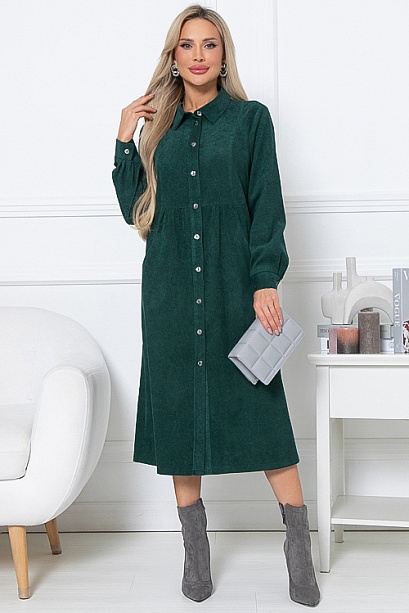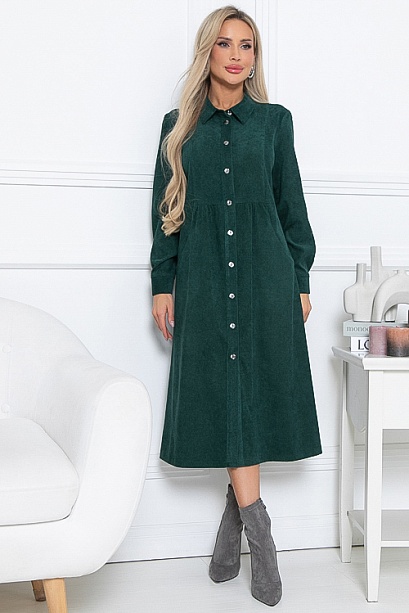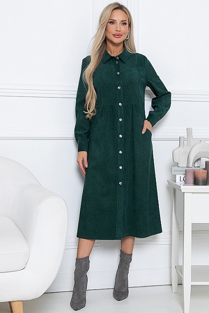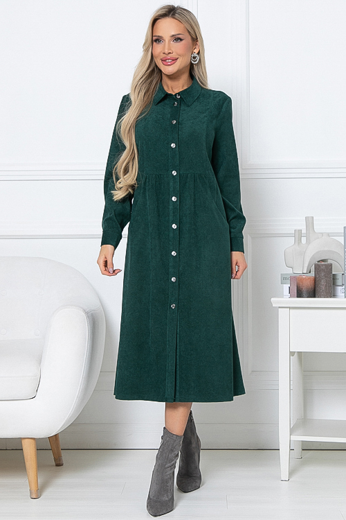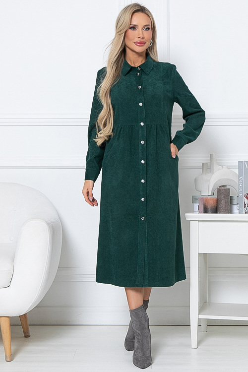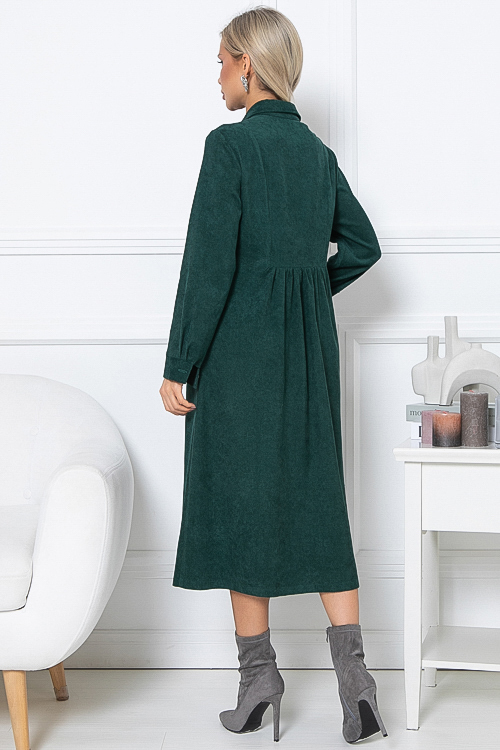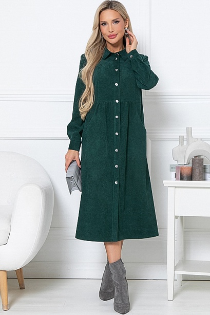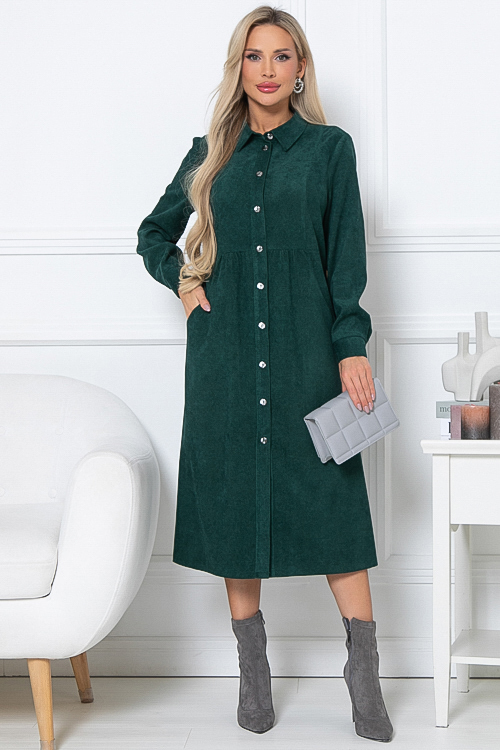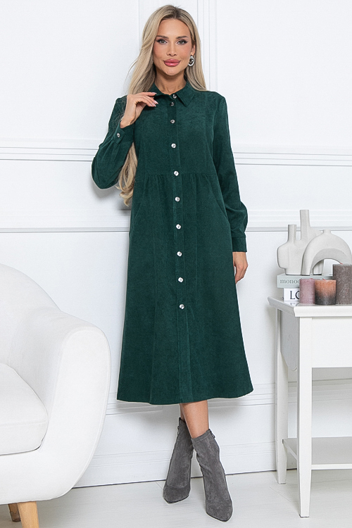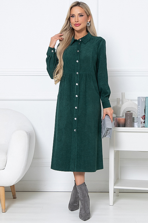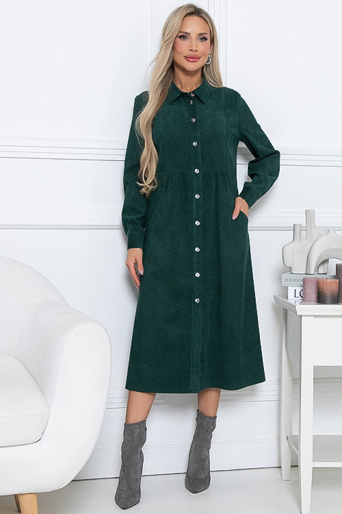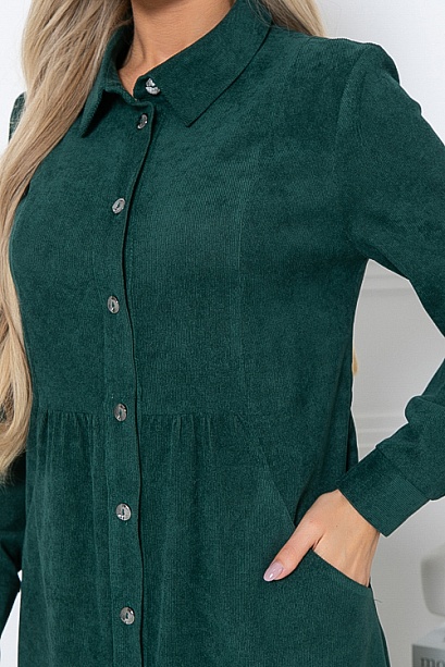 - Платье из микровельвета свободного силуэта.По переду центральная застежка на пуговицы до низа и функциональные карманы.Воротник отложной на стойке.