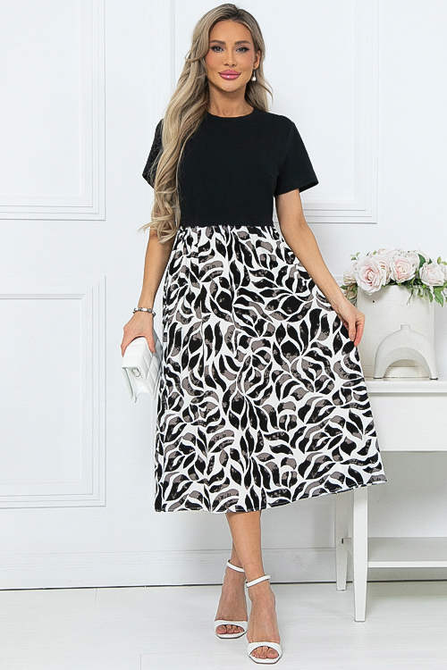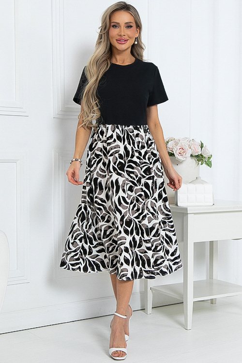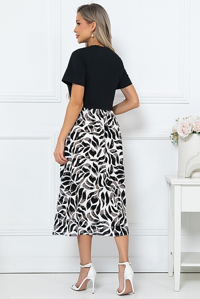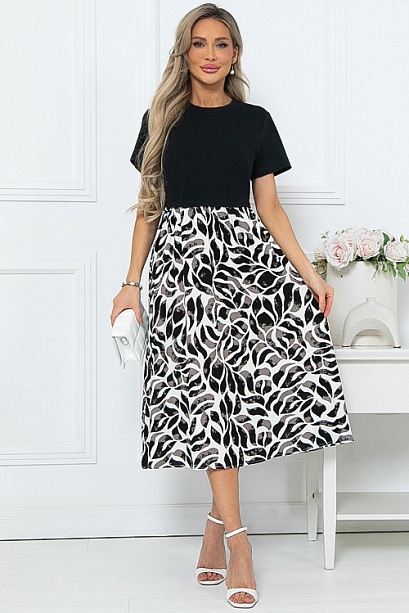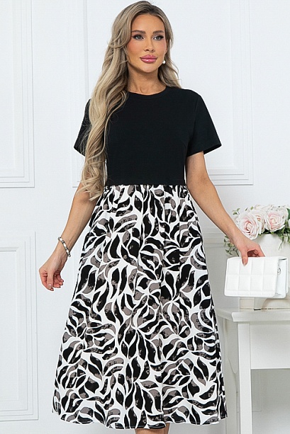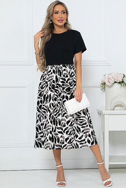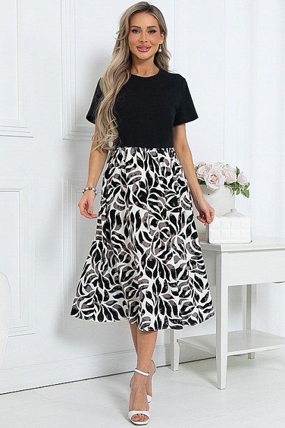 - Комбинированное платье из двух видов ткани свободного силуэта с расклешенной юбкой и функциональными карманами по бокам.Верх из хлопкового трикотажа кулирка.Юбка из легкого вискозного текстильного полотна.