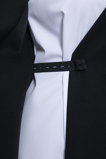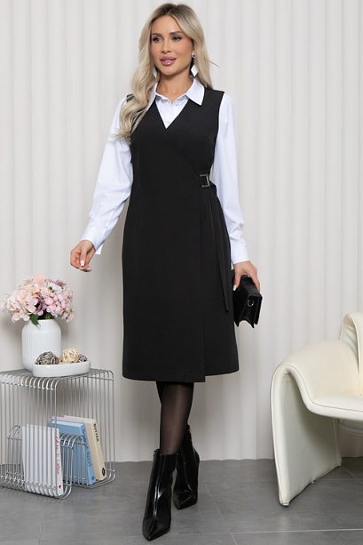 - Сарафан из костюмной ткани полуприлегающего силуэта. Перед с полным функциональным запахом застегивающимся на пряжку, внутри фиксируется регулируемой резиной с петлями.