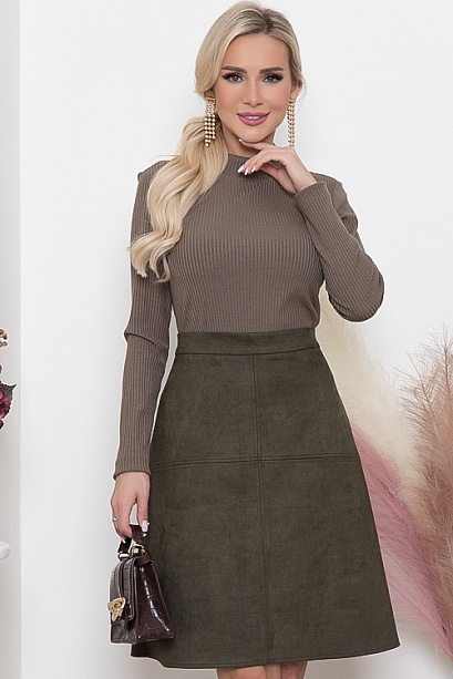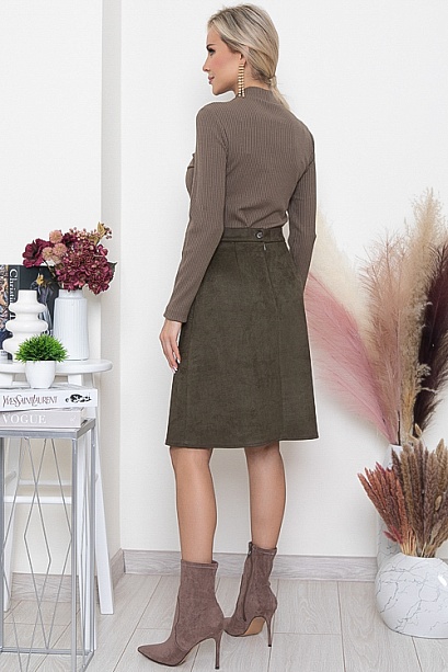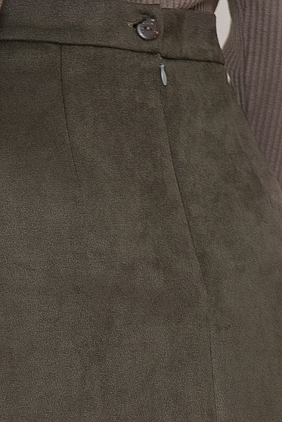 - Юбка трапеция из искусственной замши на притачном поясе и застежкой в среднем шве спинки на пуговицу и потайную молнию.