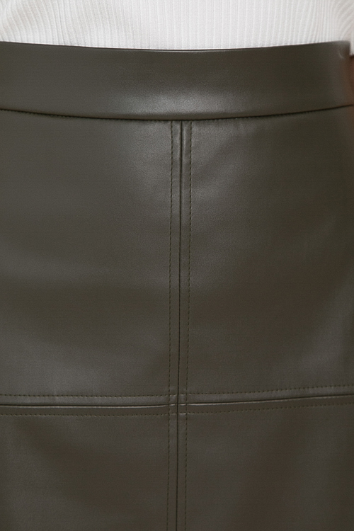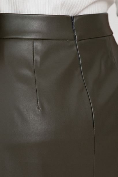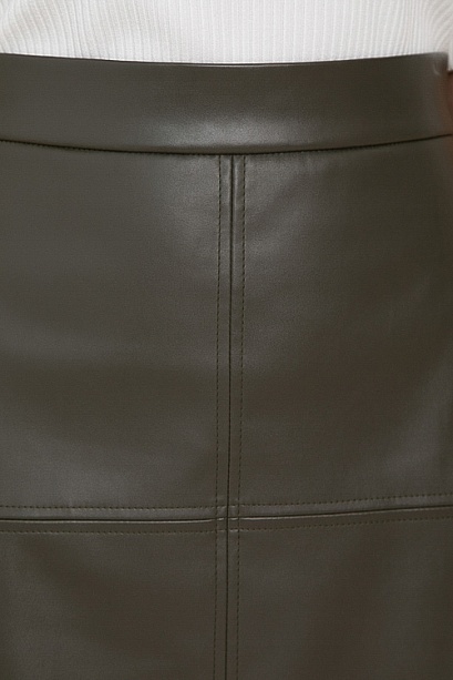 - Юбка трапецевидного силуэта из эко кожи с притачным поясом и застежка молния по спинке.