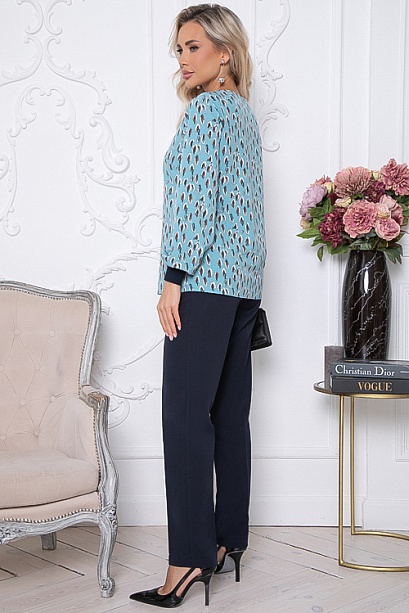 - Комплект состоящий из блузки и брюк. Блузка свободного силуэта из текстильного полотна, низ рукавов с манжетами из трикотажной рибаны.Брюки из костюмной ткани с высокой посадкой, зауженные к низу, по поясу эластичная резина .В среднем шве переда имитация гульфика. По бокам функциональные карманы. Заутюженные стрелки придают стройность фигуре.