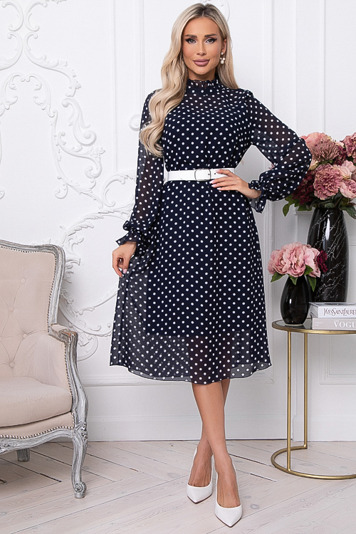 - Платье трапецевидного силуэта из шифона в горох.Ворот стойка с рюшей с застежкой сзади на петли и пуговицы.Изделие посажено на трикотажный подклад.Ремень в комплект не входит.Цвет: т.синий.