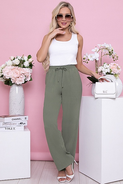 Брюки свободного,прямого силуэта из комфортного текстильного полотна с посадкой по талии присборенные на эластичную резину.В боковых швах функциональные карманы.