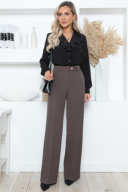 Брюки из костюмной ткани прямого силуэта с высокой посадкой по талии и заутюженными стрелками.По центру застежка гульфик-молния.Пояс притачной застегивающийся на пуговицу.Для удобства в носке пояс по спинке собран на резину.В боковых швах расположены функциональные карманы с отрезным бочком.По поясу настрочены шлевки.