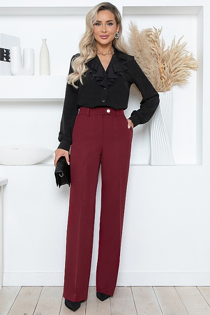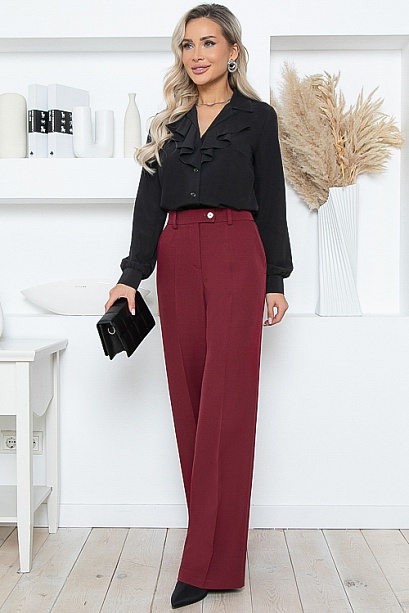 Брюки из костюмной ткани прямого силуэта с высокой посадкой по талии и заутюженными стрелками.По центру застежка гульфик-молния.Пояс притачной застегивающийся на пуговицу.Для удобства в носке пояс по спинке собран на резину.В боковых швах расположены функциональные карманы с отрезным бочком.По поясу настрочены шлевки.