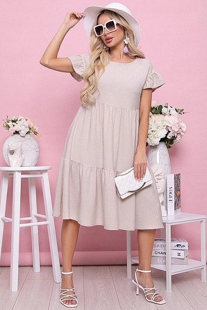 Платье из текстильного полотна свободного А-образного силуэта с двумя ярусами оборок.