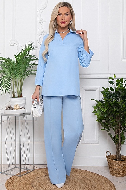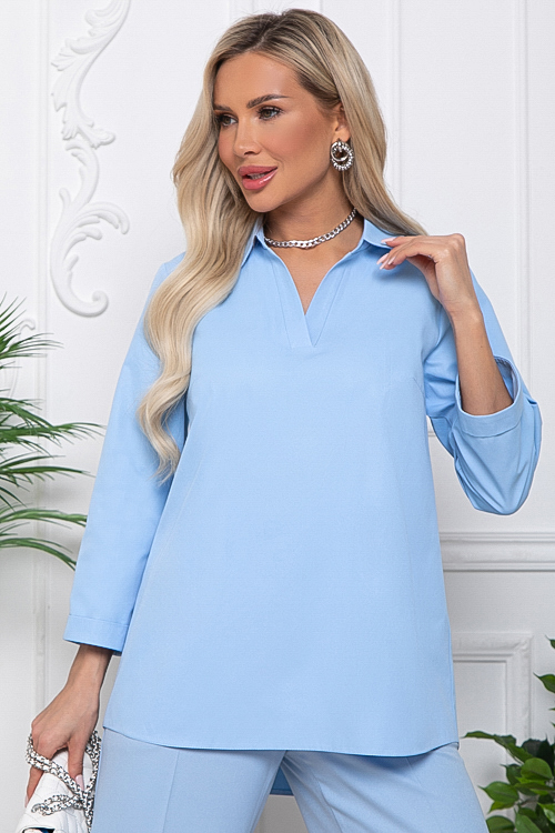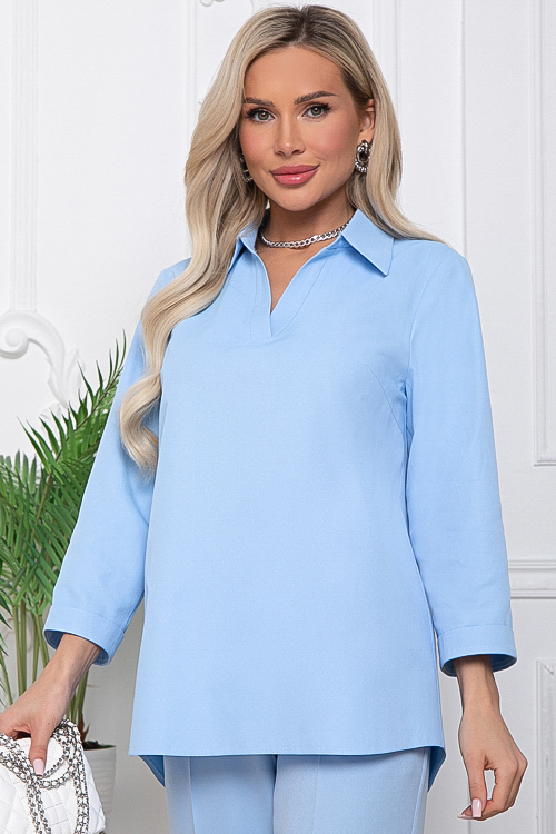 - Блузка из текстильного полотна свободного силуэта.Горловина с V-образным вырезом и отложным воротником на стойке.