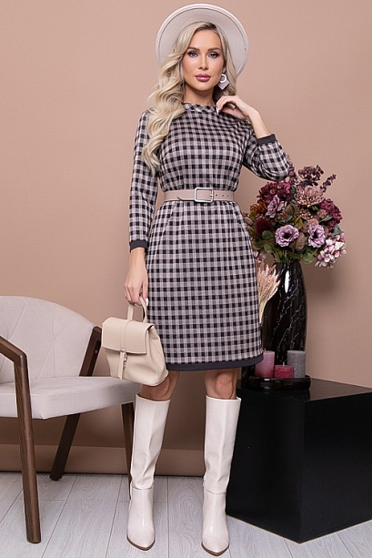 Платье из жаккардового трикотажного полотна в клетку прямого силуэта с контрастной отделкой.Ворот стойка.Ремень в комплект не входит.