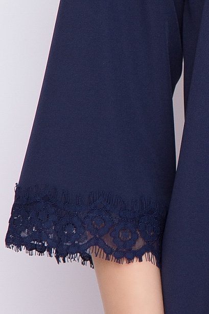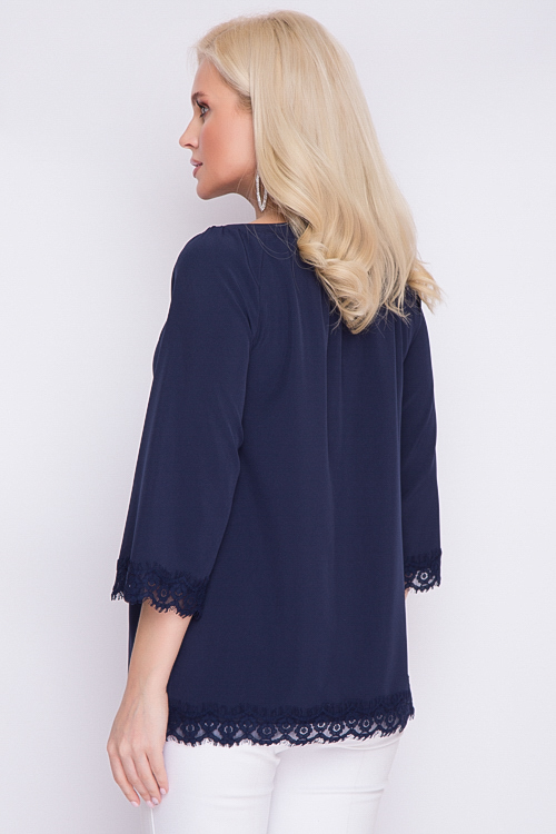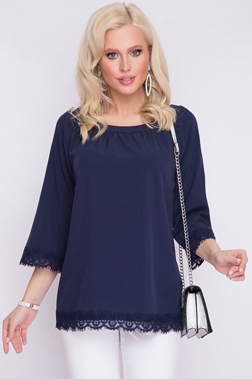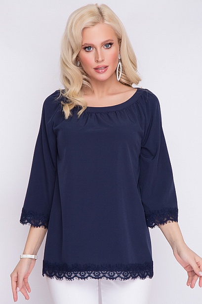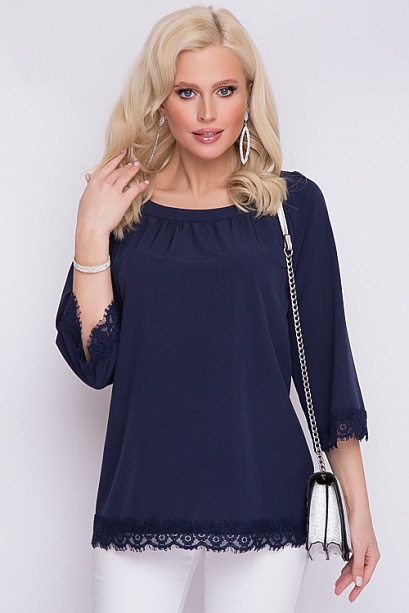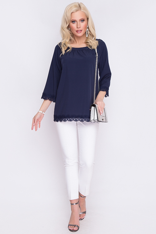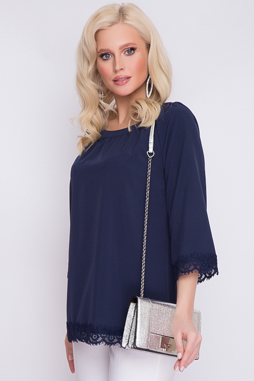 Блузка из текстильного полотна свободного силуэта с отделкой кружевом по низу и по рукавам.