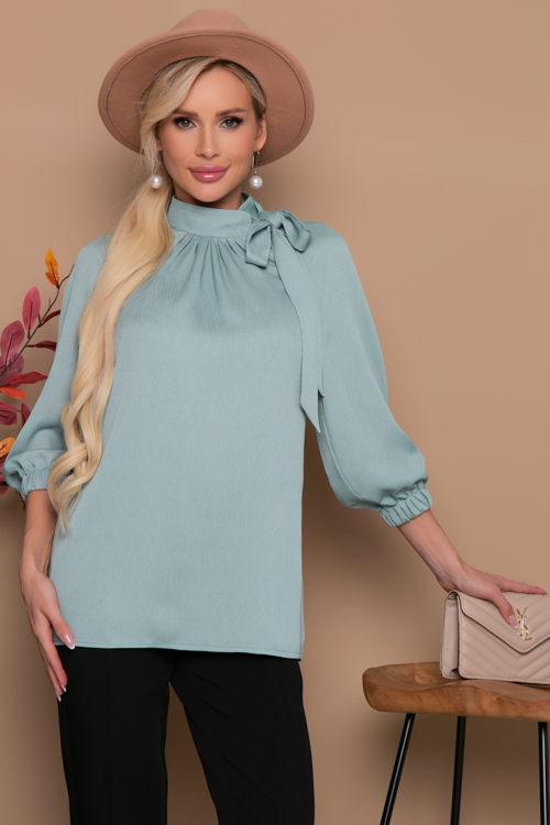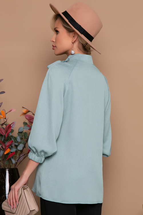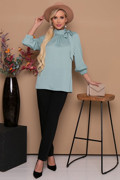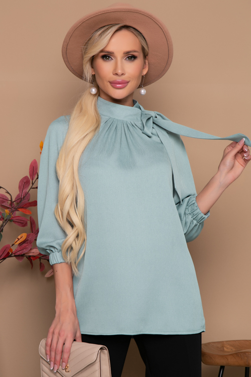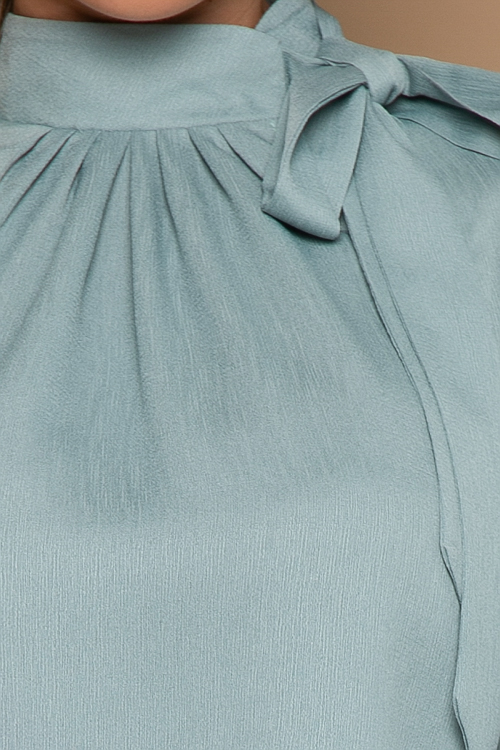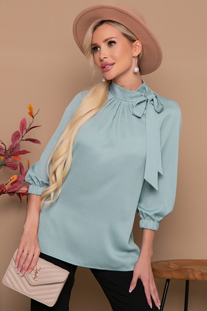 Блузка из текстильного полотна свободного силуэта с рукавами реглан,со сборкой от горловины и воротником стойка застегивающимся на потайную пуговицу и переходящим в шарф.