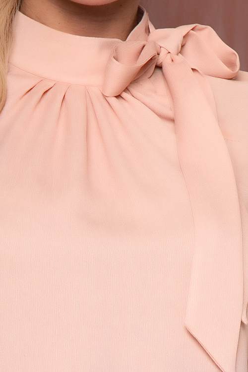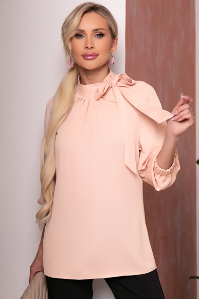Блузка из текстильного полотна свободного силуэта с рукавами реглан,со сборкой от горловины и воротником стойка застегивающимся на потайную пуговицу и переходящим в шарф.