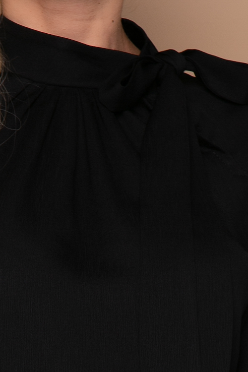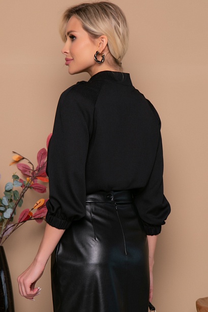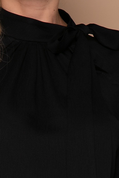 Блузка из текстильного полотна свободного силуэта с рукавами реглан,со сборкой от горловины и воротником стойка застегивающимся на потайную пуговицу и переходящим в шарф.
