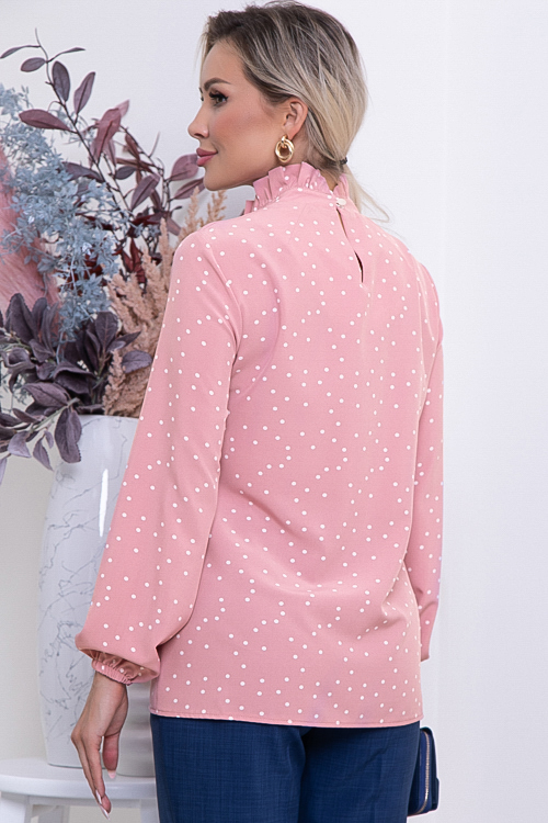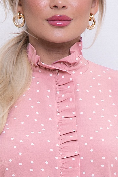 Блузка из текстильного полотна в горох. Горловина стойка с рюшей переходящая на полочку.По спинке застежка на навесную петлю и пуговицу.