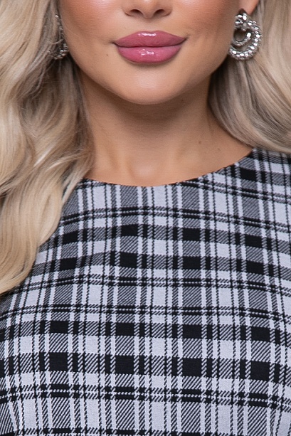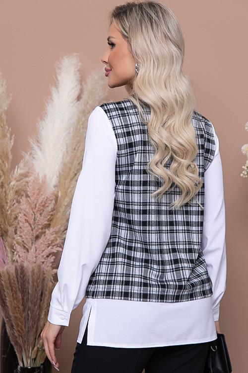 Комбинированная блузка из жаккардового трикотажного полотна в клетку и белого текстильного полотна.Сочетание тканей создают имитацию жилета с блузкой.В боковых швах разрезы.В комплекте пояс.