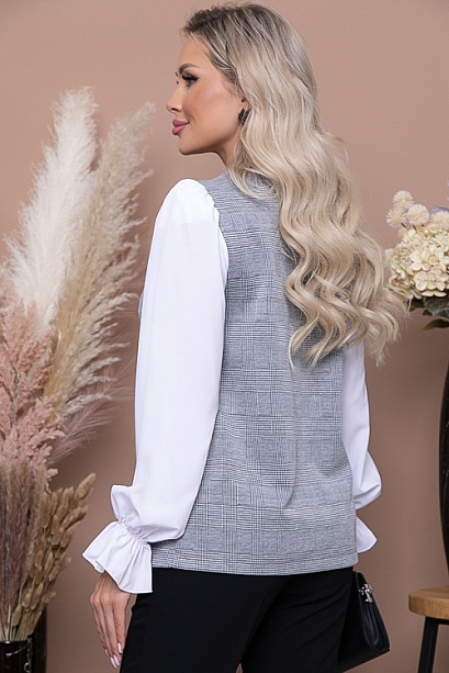 Комбинированная блузка из жаккардового трикотажного полотна с V-вырезом оформленным текстильной рюшей и рукавами из текстильного полотна.