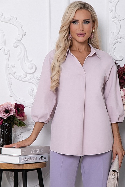 Блузка из плотного дышащего хлопка свободного силуэта.Воротник отложной на стойке.Рукав свободный с мягкими защипами.