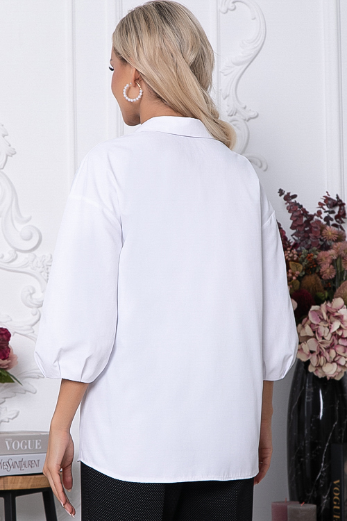 Блузка из плотного дышащего хлопка свободного силуэта.Воротник отложной на стойке.Рукав свободный с мягкими защипами.