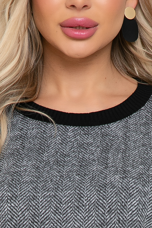 Комбинированный джемпер из трикотажного полотна в елочку и экокожи.