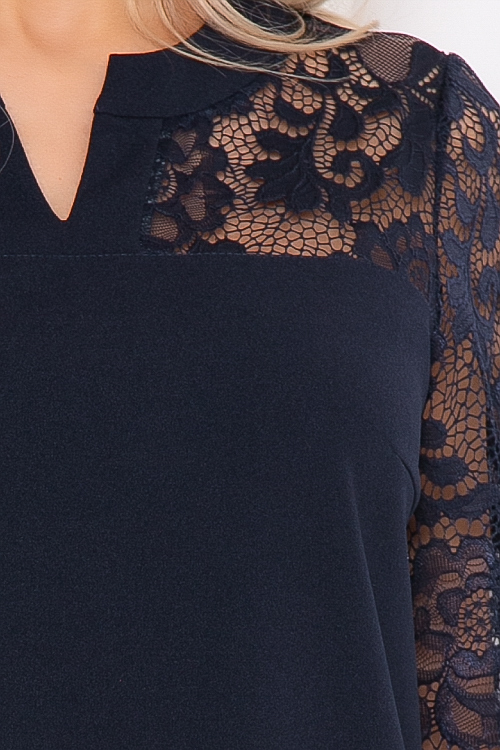 Комплект двухпредметный из трикотажного полотна,состоящий из брюк и блузона.Блузон комбинированный с кружевом свободного силуэта.Брюки прямые слегка заужены к низу,по поясу резина,без застежки,с имитацией гульфика.