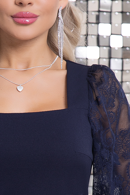 - Платье из трикотажного полотна с вырезом каре и рукавами из кружева.