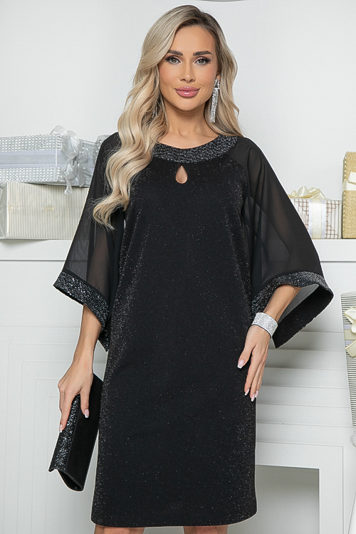 - Нарядное платье А-образного силуэта из трикотажного полотна с легким люрексом.Рукава реглан из прозрачного шифона.Горловина и манжеты рукавов выполнены из трикотажа с пайетками.
