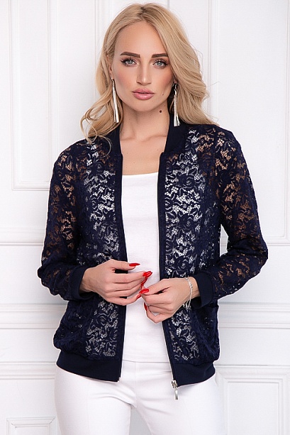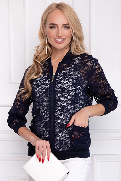 - Бомбер из кружевного полотна свободного силуэта с центральной застежкой на молнию и функциональными накладными карманами.