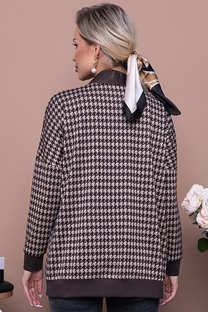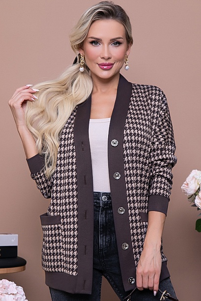 Кардиган свободного силуэта из жаккардового трикотажного полотна в клетку с однотонной отделкой.